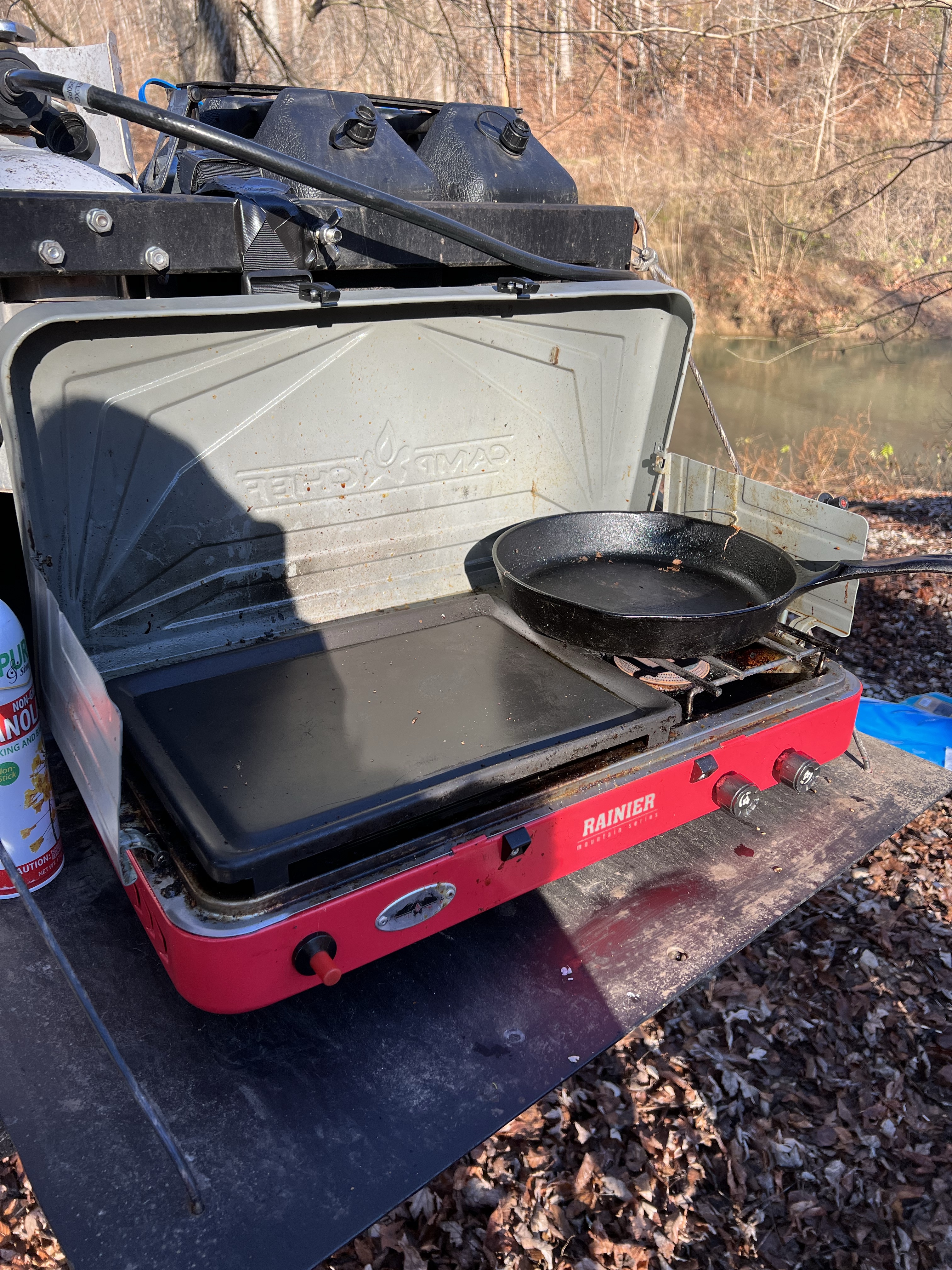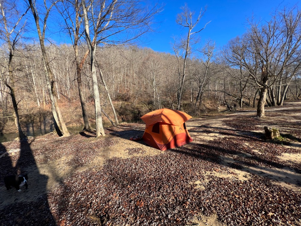 Campsite on the Red River for the first two nights.If you’re going to tent camp below freezing, I can’t recommend a Mr. Heater, good thermal underwear and an appropriately rated sleeping bag enough. I pre-make and freeze many of our dinners to make it easier to have good, nutritious food at camp. We pop it in our travel fridge, and after a day or two, the meals are defrosted and ready to eat. On this trip, we had pineapple teriyaki meatballs with broccoli and rice, spaghetti with meat sauce, chili with rice, and beef stew (not pictured because it literally looked like baby food).Speaking of travel fridge, everything is pretty self-contained on the 4Runner. The back swings out and we have a shelf that drops down so we can put our camp stove on it and hook it right up to the propane tank. The stove tucks away into a drawer when not in use.Finally, let’s talk scenery, because Kentucky was quite pretty.